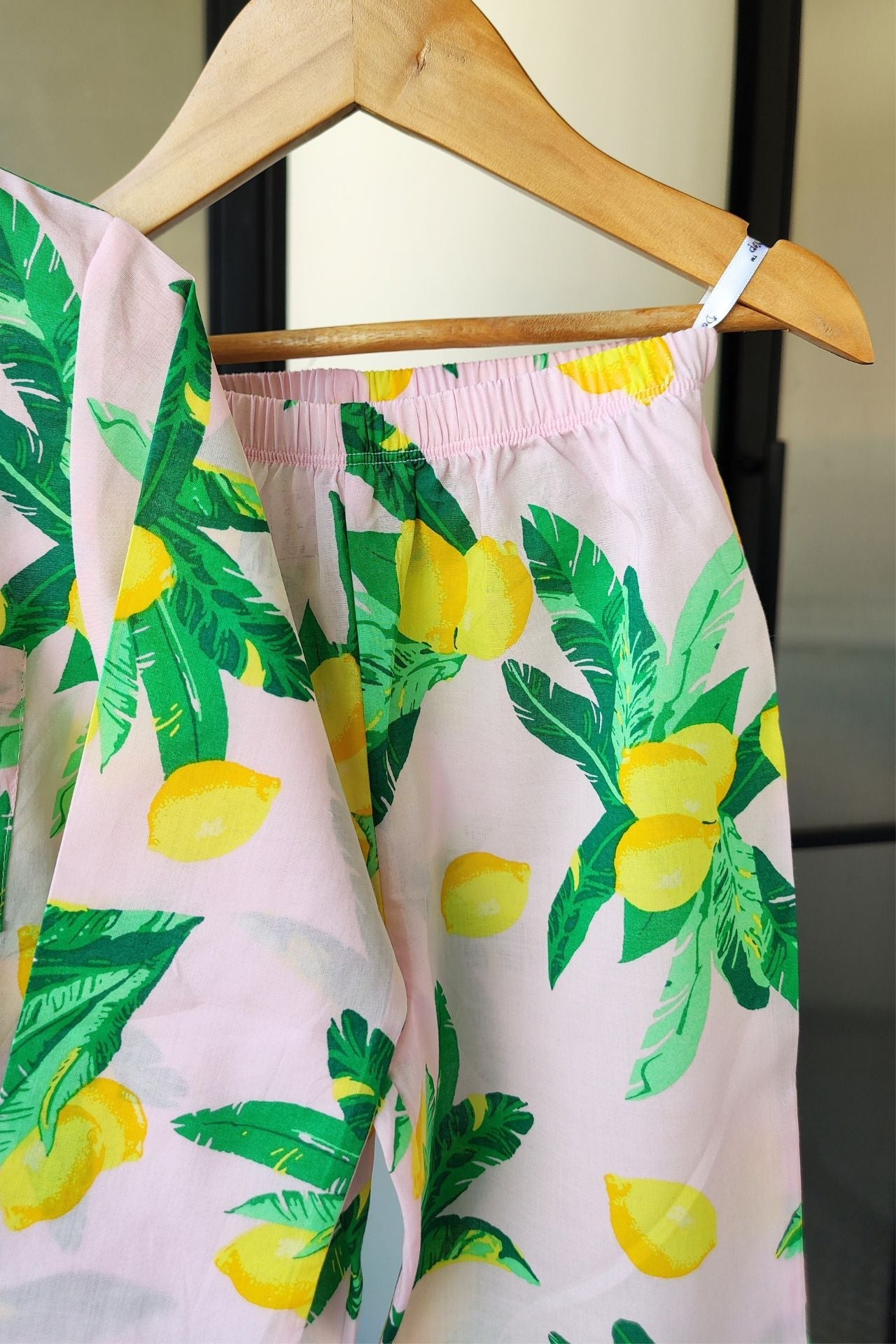 Brighten up your nights with the refreshing charm of our Lemon Bliss Kurta Pyjama Set. Crafted from soft and breathable cambric cotton, this set ensures ultimate comfort for a restful sleep. The soothing pastel pink base is adorned with vibrant lemon and lush green leaf prints, adding a touch of freshness and tropical elegance. Featuring a relaxed fit, a round neckline with a button-down front, and an elasticated waistband for ease of wear, this set is perfect for cozy nights and laid-back mornings. Experience the perfect blend of style and comfort with this lightweight and airy sleepwear set.