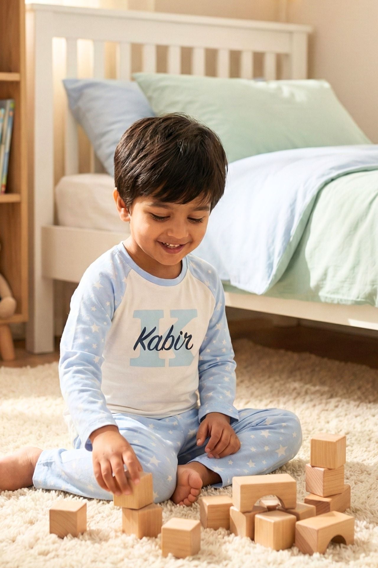 My Star PJ Set is unlike any other, bringing a unique, personalized touch to your child’s wardrobe. This made to order pyjama set, features your childs name and initials proudly displayed on a cozy off white T-shirt, paired with light blue star-print pajamas for a truly one-of-a-kind look. Thoughtfully crafted for comfort and joy, this PJ set makes bedtime extra special, creating an unforgettable, personalized experience that every child will cherish.