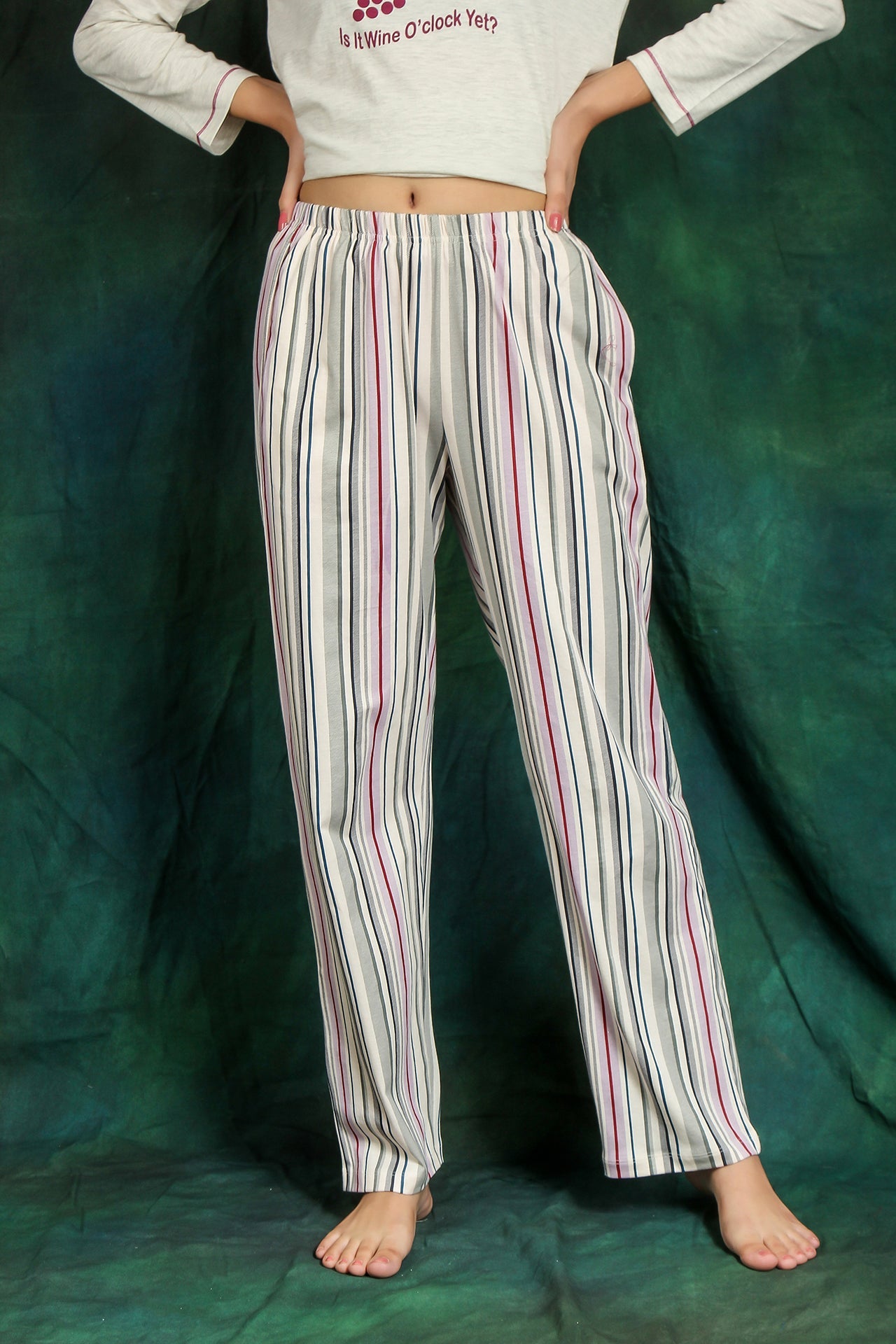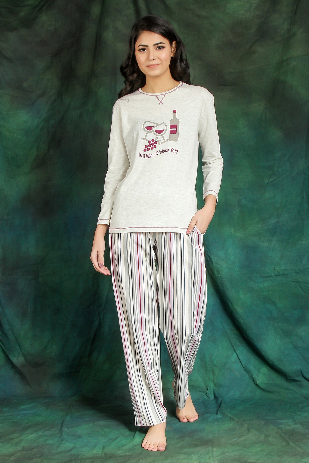 Its time to celebrate . Get into our finest nightwear sets , The chest print has a perfect print of wine o clock.Beautiful Ecru melange colour with matching stripes pyjamas.Choice of getting full sleeves or short sleeves.Made of 100%cotton knits bio finish.