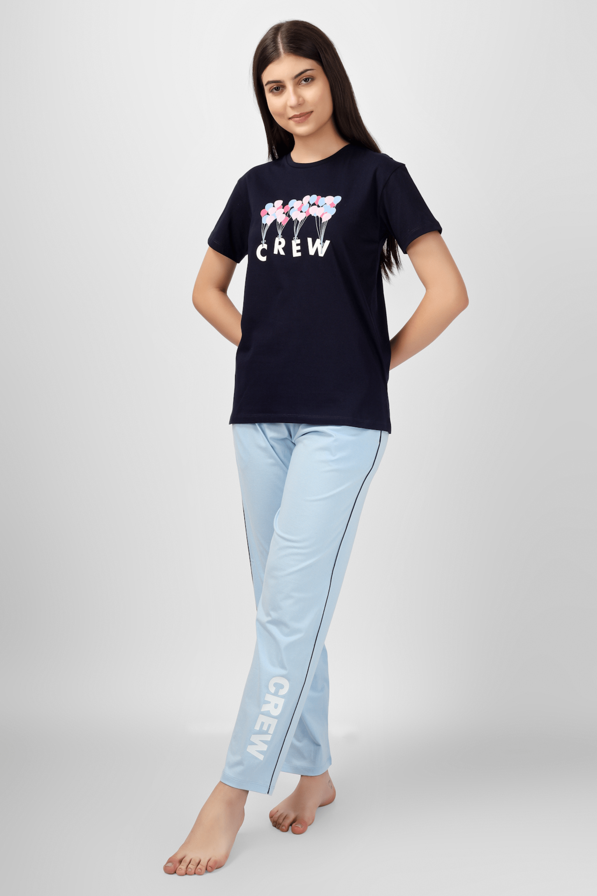Discover the perfect blend of comfort and style with our Navy Crew Chic Pyjama Set for Women. This set features a solid navy top adorned with a cute chest print, a classic round neckline, and short sleeves. The light blue solid bottoms are elegantly detailed with side piping and the word 'Crew' printed at the ankle. Embrace sophistication and relaxation, all in one delightful package.