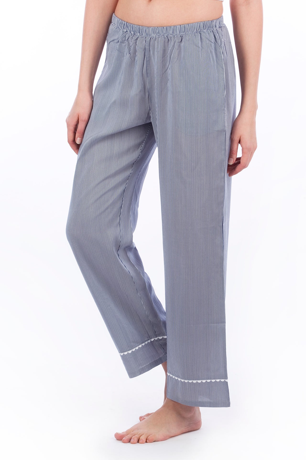 Soft and flowy navy pinstripes viscose bottoms.Relaxed fit, bottom hem has zig zag lace .