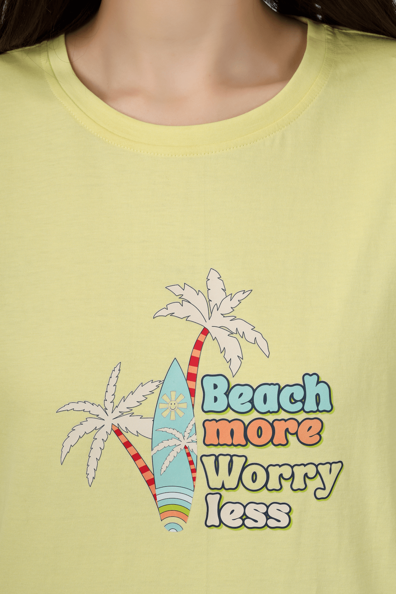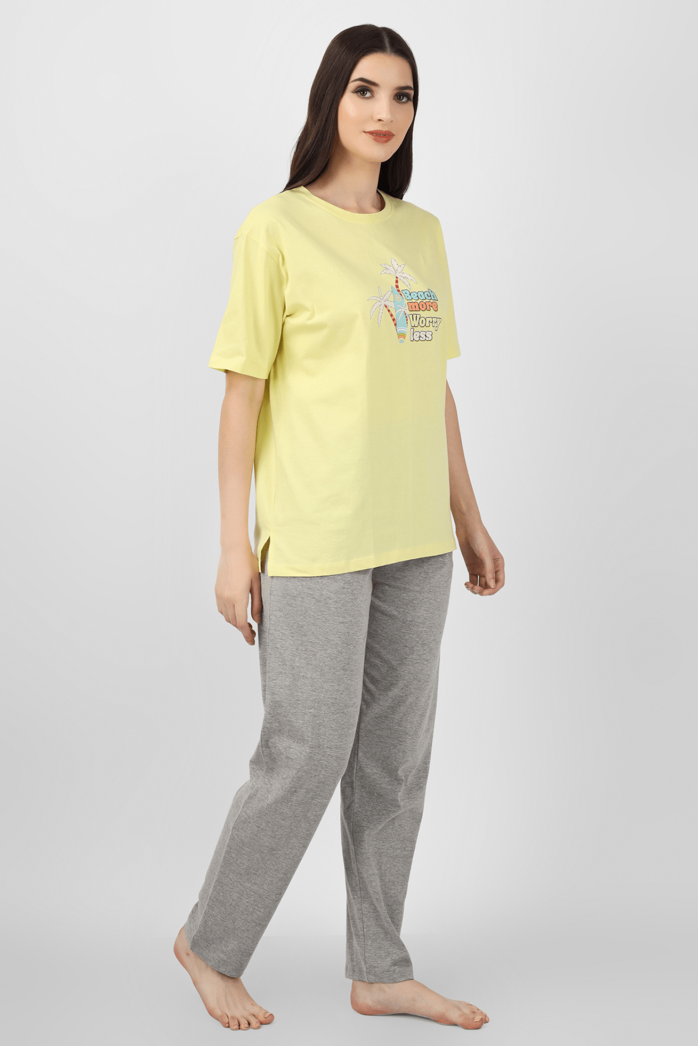 Unwind in style with our Yellow/Grey Sun-Kissed Dreams Pyjama Set, a must-have in women's nightwear. Embrace comfort with the soft touch of 100% cotton knits. The sun-kissed yellow top features a cute "Beach More Worry Less" print, reminding you to find solace in life's simple pleasures. Paired with cozy grey pyjamas, this set is your invitation to relax and dream.