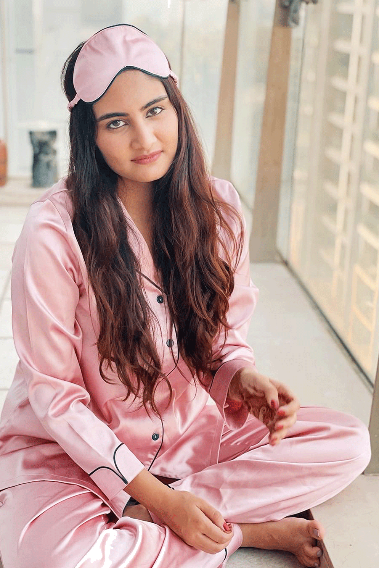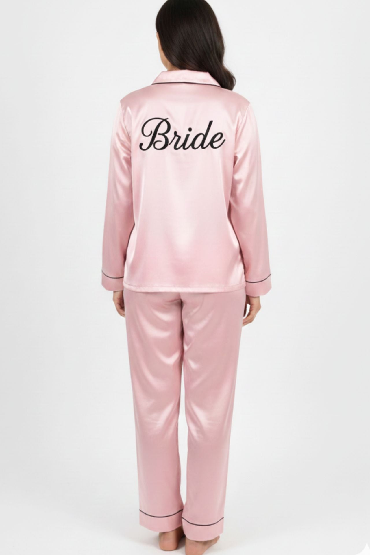 Blush pink satin nightwear with elegant contrast piping (photo-ready!)
