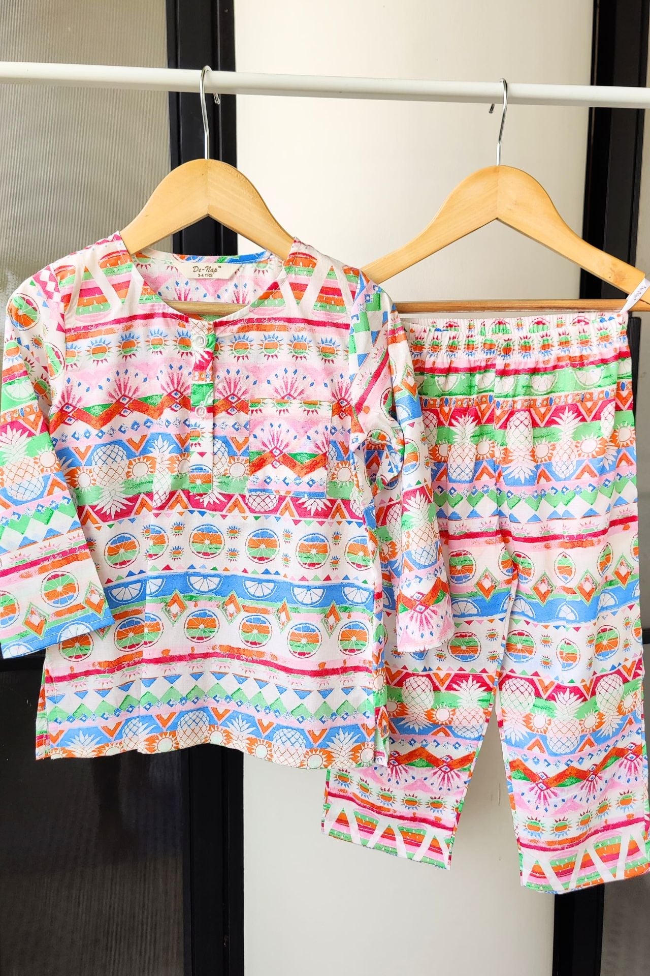 DESCRIPTIONAdd a burst of color to your child’s wardrobe with our Colorful Tribal Print Kids Cotton Kurta Pajama Set. Made from 100% soft, breathable cotton, this vibrant ethnic outfit features a unique tribal-inspired multicolor print that blends tradition with playful charm. The kurta comes with a round neck, button-down front, and long sleeves for comfort and ease. The matching pajama has a relaxed fit with an elasticated waistband, perfect for active days or festive occasions. Ideal for festivals, family gatherings, traditional functions, or lounge wear, this kids kurta pajama set ensures style without compromising on comfort. PRODUCT INFORMATION