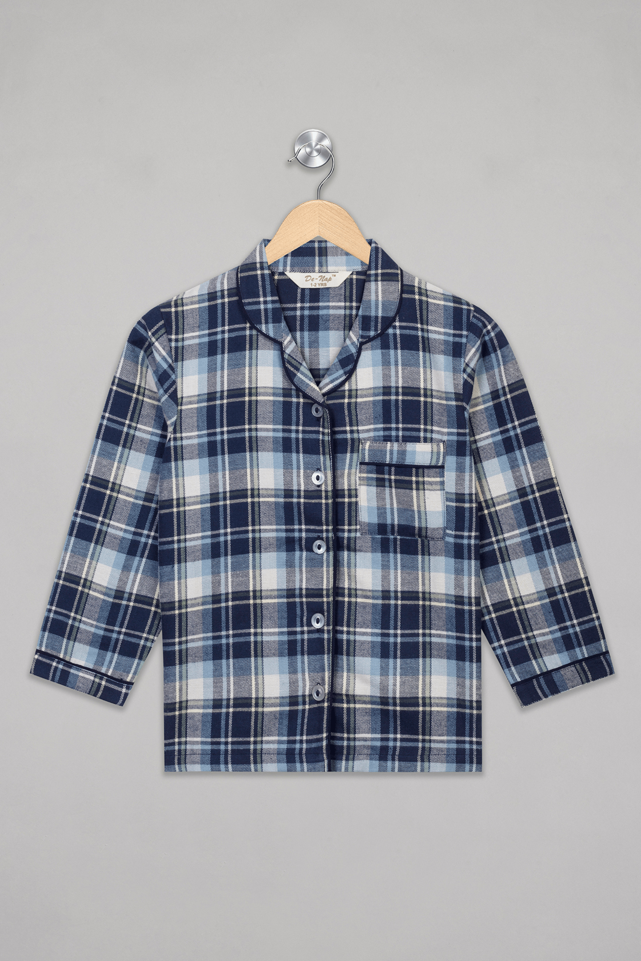 Introducing our Navy Checks Flannel Full Sleeves Pyjama Set for kids – where comfort meets style! This front-open set with a notch collar is a cozy haven for bedtime. The classic navy checks add a touch of charm, ensuring your little one sleeps in both comfort and fashion. Elevate their sleep routine with this delightful blend of warmth and trendy design.